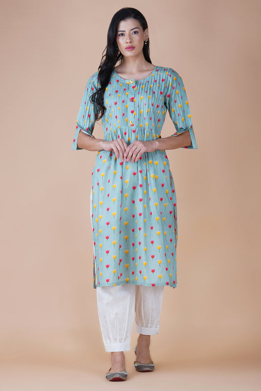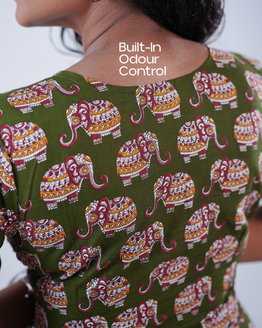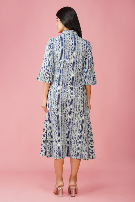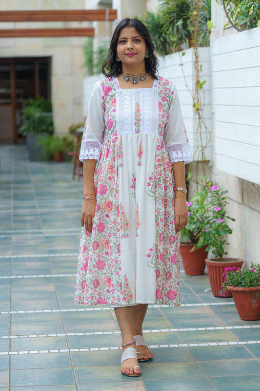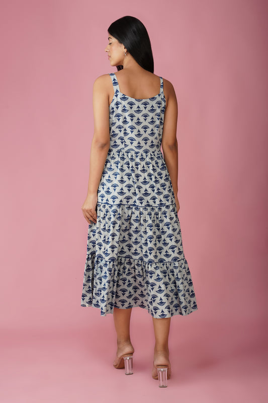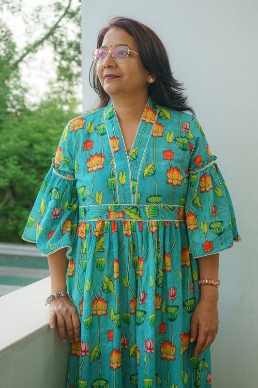 Jaipur Parade Hand Block Print Cotton Midi Dress ( Short Sleeves) - Sage Dust