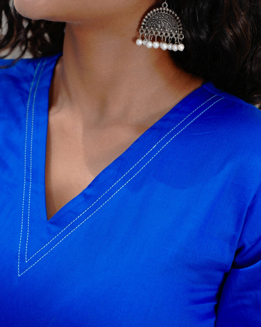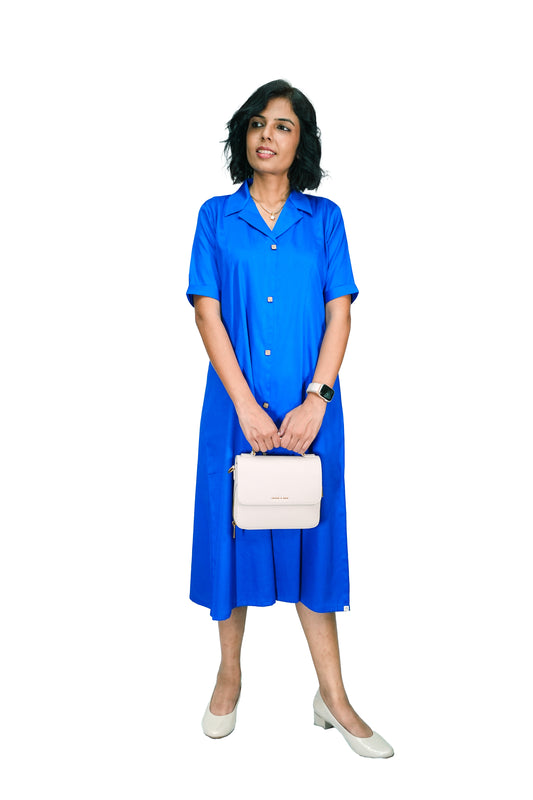 Classic V-Neck Cotton Midi Dress with Pockets - Blue Enigma