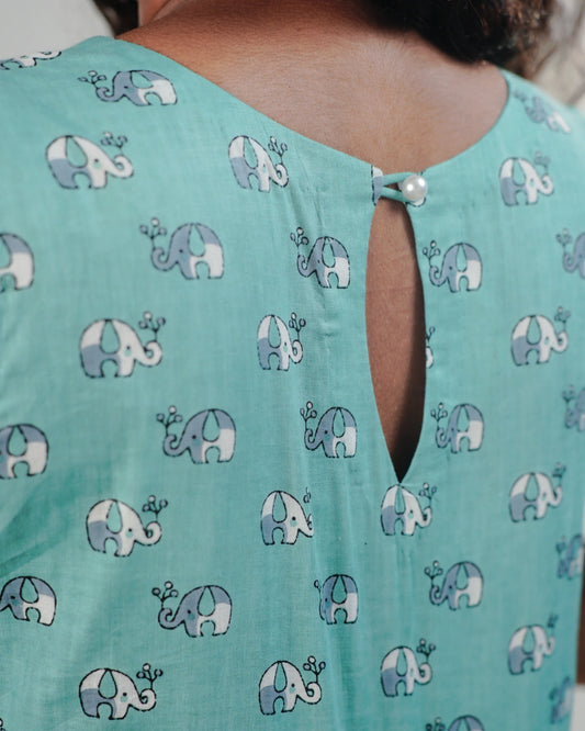 Marigold Trail Pure Cotton Block Print Midi Dress(Short sleeves) - Aqua Grove