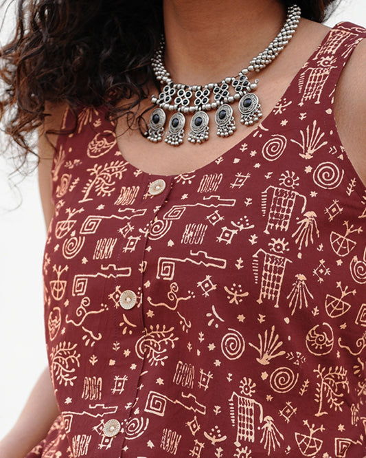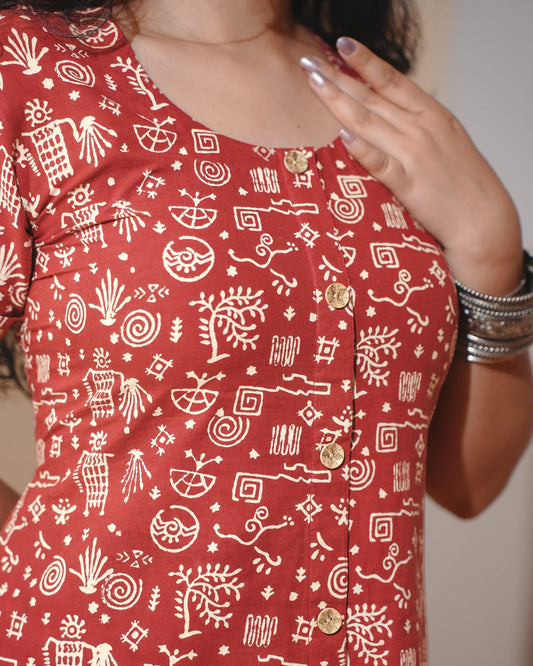 Pure Cotton Worli Art Midi Dress with Sleeves(Short sleeves) - Terracotta Rouge