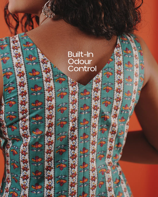 Marigold Trail Pure Cotton Block Print Midi Dress (Sleeveless) - Aqua Grove