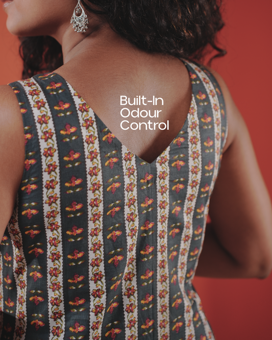 Marigold Trail Pure Cotton Block Print Midi Dress(Sleeveless) - Charcoal Petal