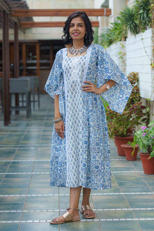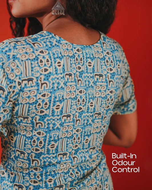 Pure Cotton Worli Art Midi Dress with Sleeves(Short sleeves) - Blue Mirage