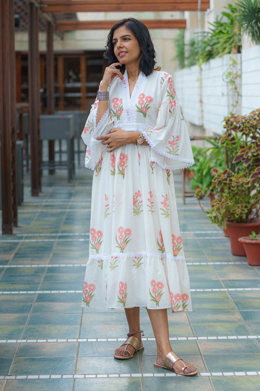 Jaipur Parade Hand Block Print Cotton Midi Dress(Short sleeves) - Burnt Coral