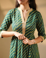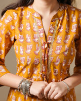 Style: Anarkali-style kurti with a relaxed flare, three-fourth sleeves, and functional side pockets.