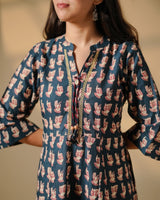 Made from pure cotton, this kurti is light, comfortable, and easy to wear all day. The dark base with block-printed motifs gives it a simple yet stylish look, making it perfect for both everyday wear and festive gatherings.