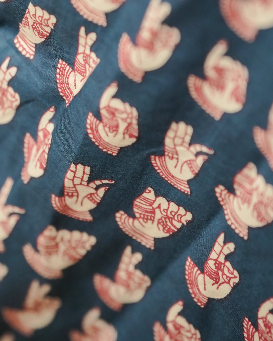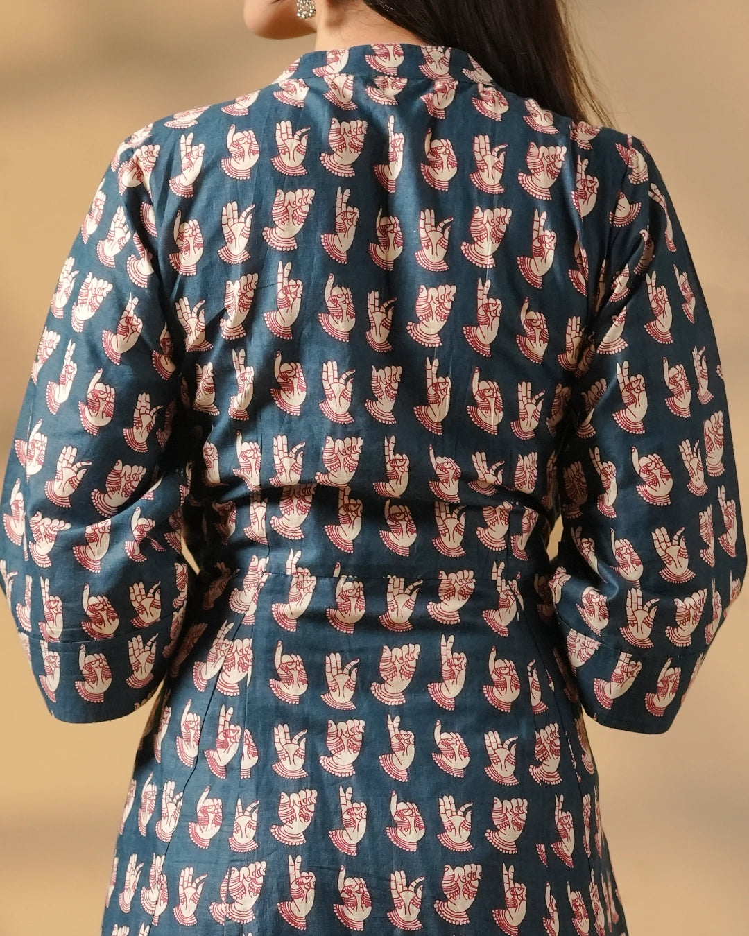 Design: Block-printed motifs on a navy base for a balanced and versatile look.